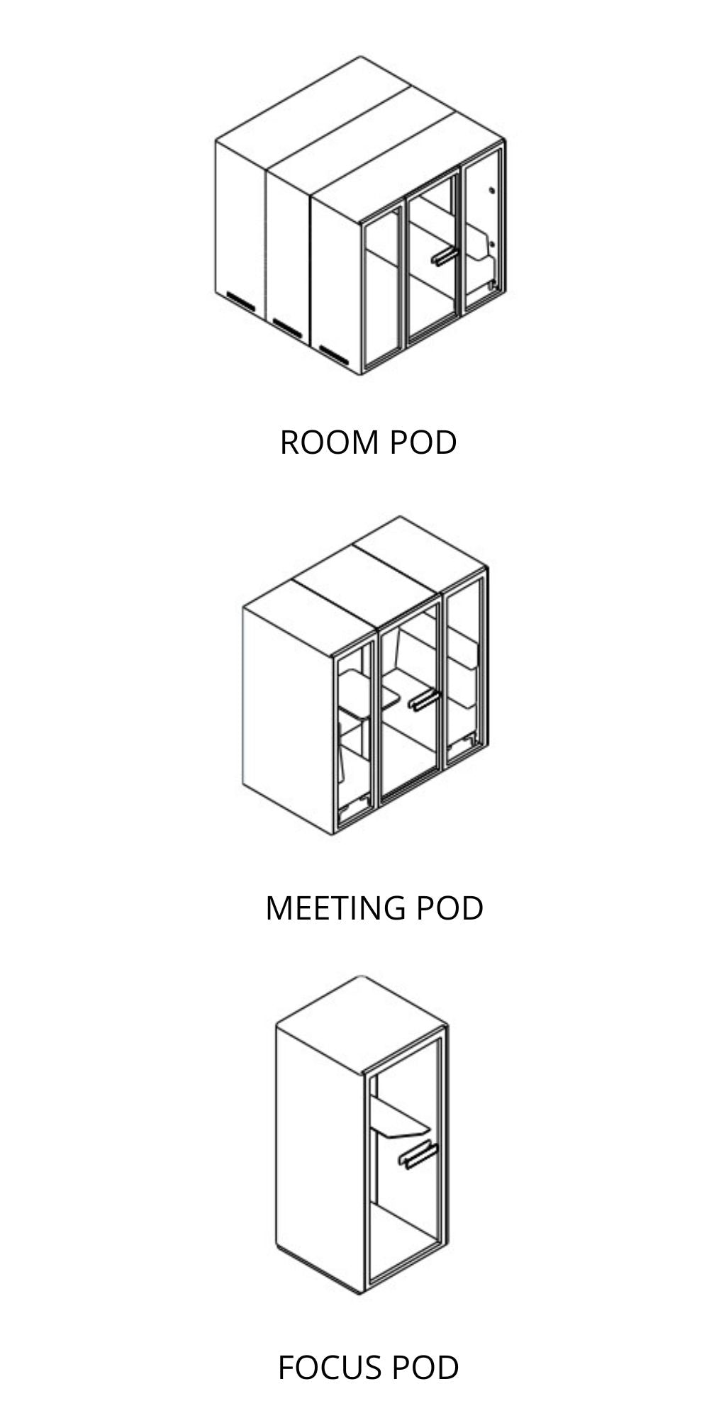 - Available in 3 sizes: Focus Pod, Meeting Pod, and Room Pod